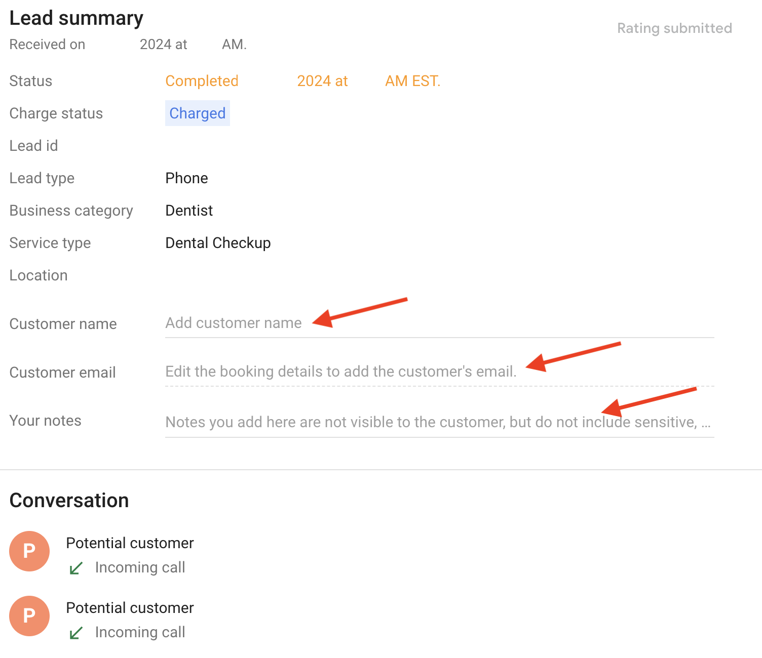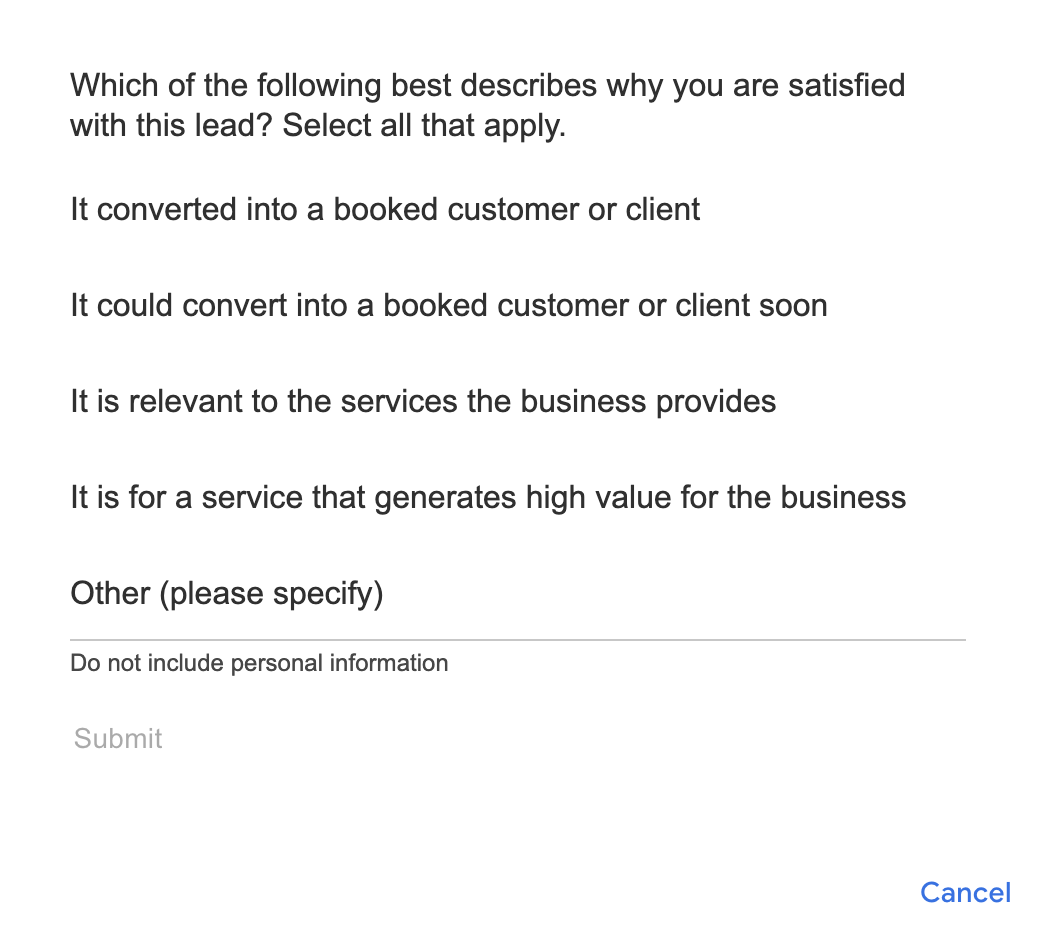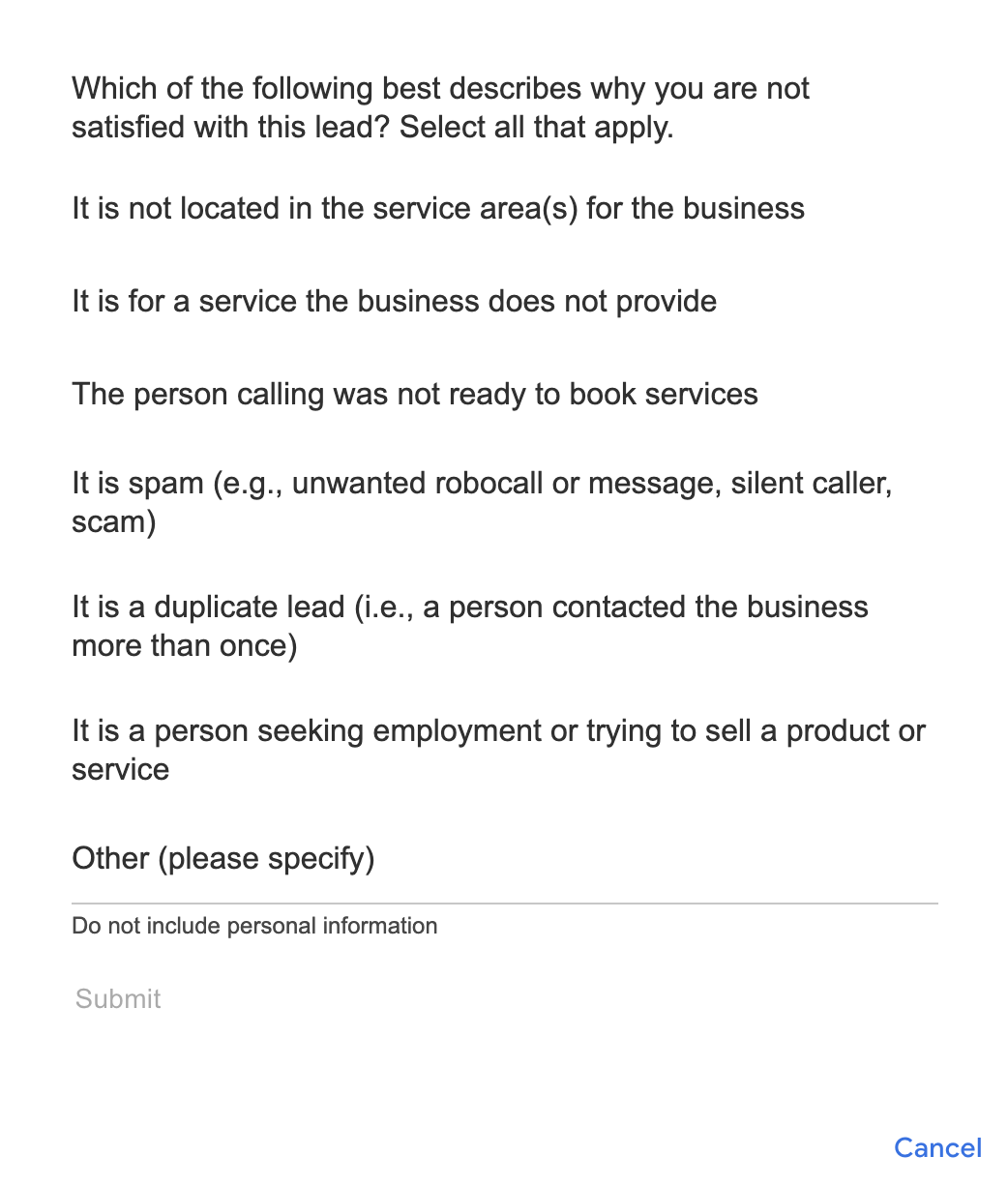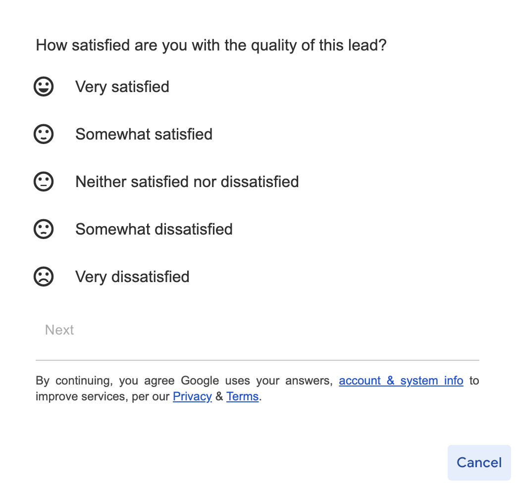 If you rate a lead as either "Dissatisfied" or "Very Dissatisfied," it is very important that you provide Google with enough information to determine if they should issue a credit for the lead.