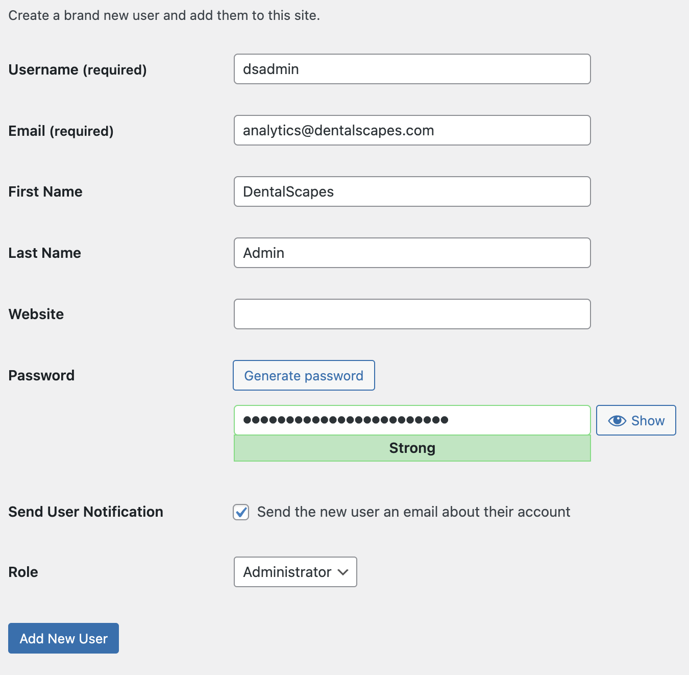 - Fill out the form with dsadmin for the username, and analytics@dentalscapes.com for the email address. Click Generate Password to automatically set a strong password, make sure the Send User Notification checkbox is selected, and that the Role is set to Administrator, then click Add New User!