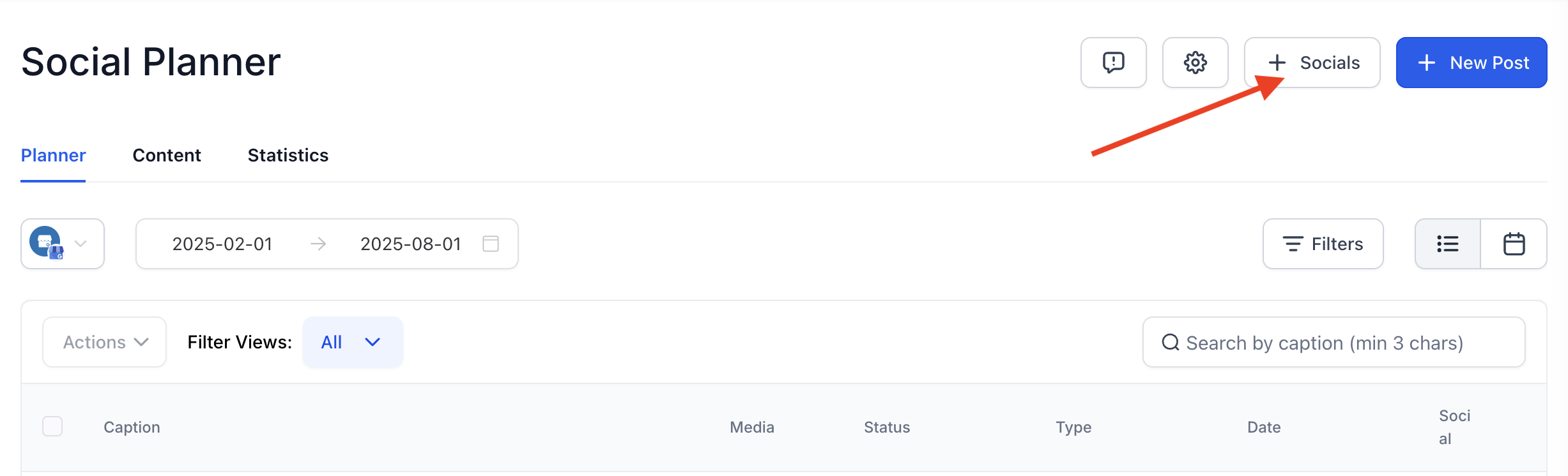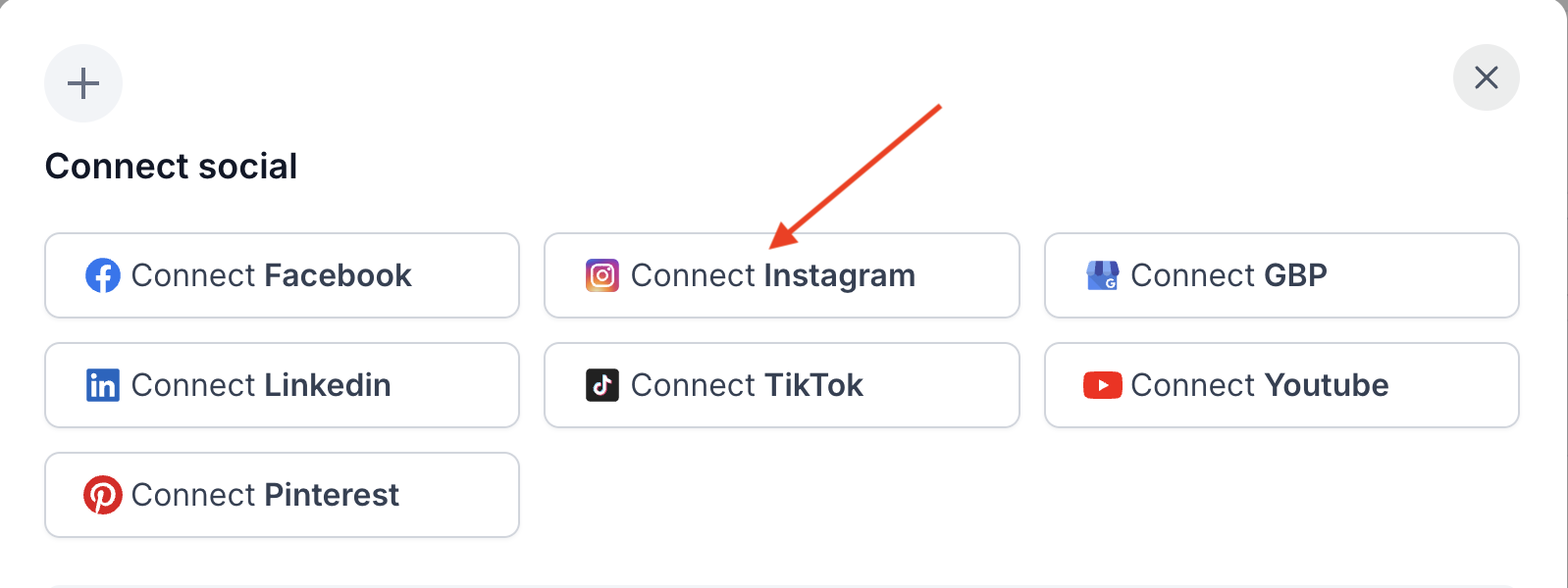 To get started, please go to Social Planner. In the top right corner of Social Planner, there is "+ Socials" shortcut to add a social network.